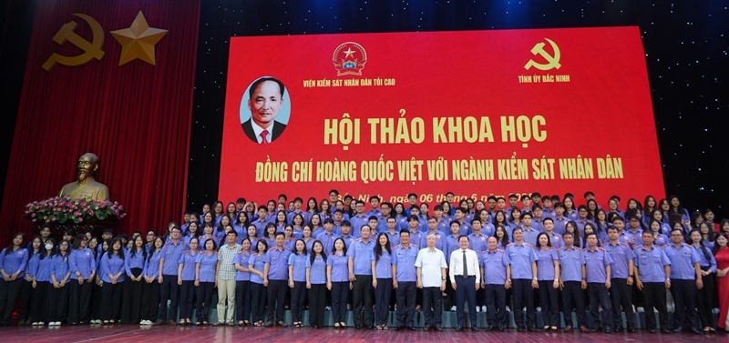 Các đại biểu chụp ảnh lưu niệm tại Hội thảo khoa học “Đồng chí Hoàng Quốc Việt với ngành Kiểm sát nhân dân” do VKSND cao phối hợp với Tỉnh ủy Bắc Ninh tổ chức (ngày 6/6/2025).
