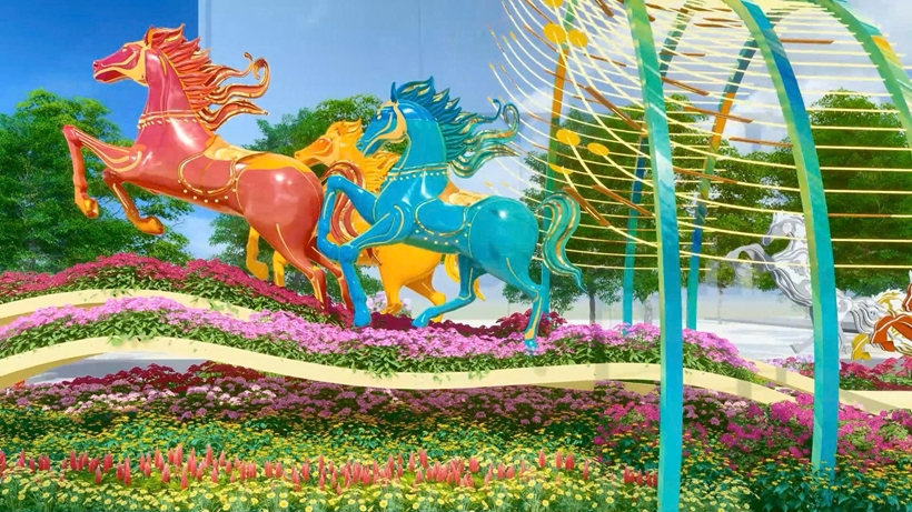| Điểm nhấn của đường hoa năm nay là “Nhất mã thong dong”, là linh vật lớn nhất Đường hoa với chiều cao gần 7m. Được chế tác từ chất liệu tre đan hình học thân thiện với môi trường, chú ngựa khổng lồ này tạo ra một không gian sinh thái đa tầng, nơi du khách có thể len lỏi giữa thảm thực vật để cảm nhận sự thư thái, thong dong. |