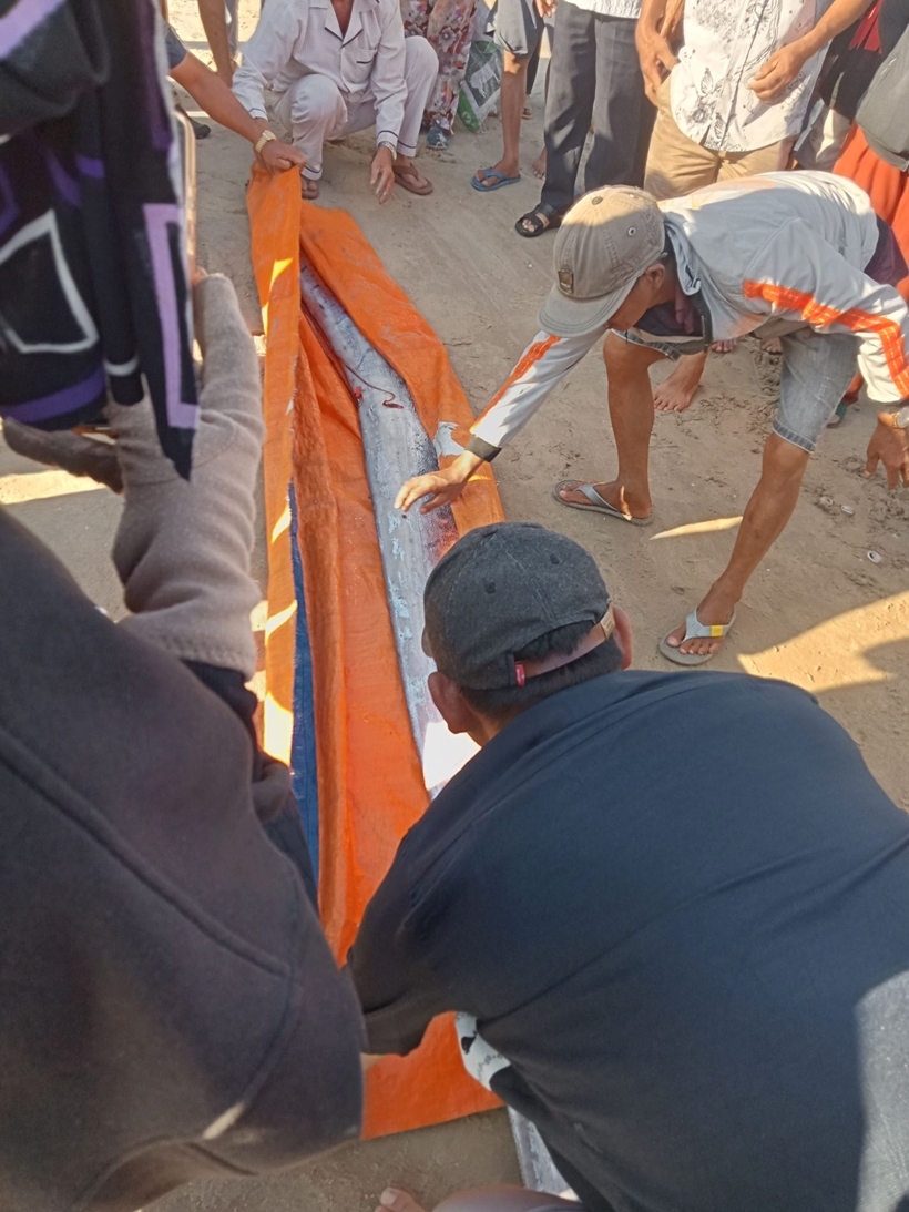 Khi dạt vào bờ, cá còn sống nhưng yếu. Người dân cố dìu  cá trở lại biển nhưng cá lại bơi vào, nên ngư dân đưa cá lên bờ.
