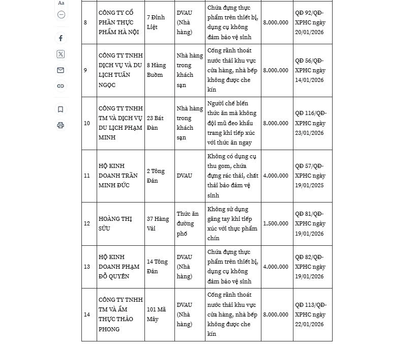 Theo thông tin được công bố trên Cổng Thông tin điện tử phường Hoàn Kiếm, danh sách 14 cơ sở vi phạm bao gồm những đơn vị bị xử lý vì không tuân thủ quy định về điều kiện bảo đảm an toàn thực phẩm trong sản xuất, kinh doanh, dịch vụ ăn uống. Việc công khai các cơ sở này nhằm nâng cao tính minh bạch trong công tác quản lý nhà nước, cảnh báo tới các cơ sở khác phải tuân thủ pháp luật an toàn thực phẩm.