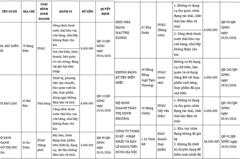 UBND phường Hoàn Kiếm vừa công khai danh sách các cơ sở bị xử lý hành chính về an toàn thực phẩm trên địa bàn, với số liệu thống kê từ ngày 1/1 đến 31/1/2026. Đây là một phần trong nỗ lực tăng cường kiểm tra, giám sát và đảm bảo an toàn thực phẩm cho người dân và du khách khu vực trung tâm Thủ đô Hà Nội.