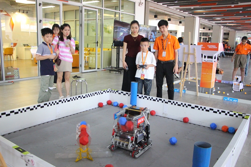 Học sinh và phụ huynh hào hứng tham gia các trải nghiệm công nghệ độc đáo như: lập trình, điều khiển robot VEX IQ, V5, FIRST… với các thử thách mang tính chiến lược.