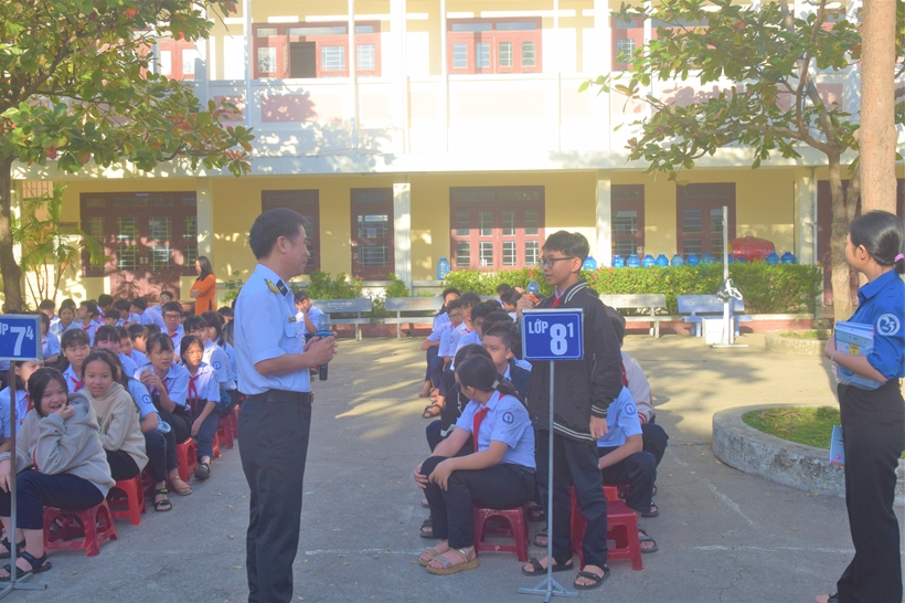 Báo cáo viên Học viện Hải quân và các em học sinh trao đổi các nội dung tại buổi tuyên truyền.