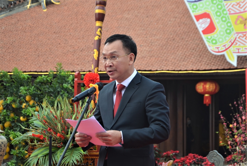 | Lãnh đạo xã Kiến Hưng phát biểu tại Lễ khai bút đầu xuân 2026. |