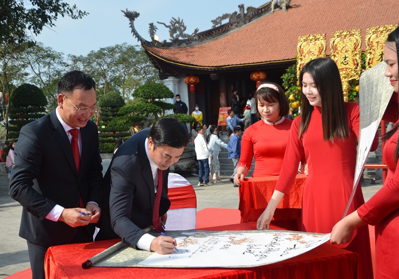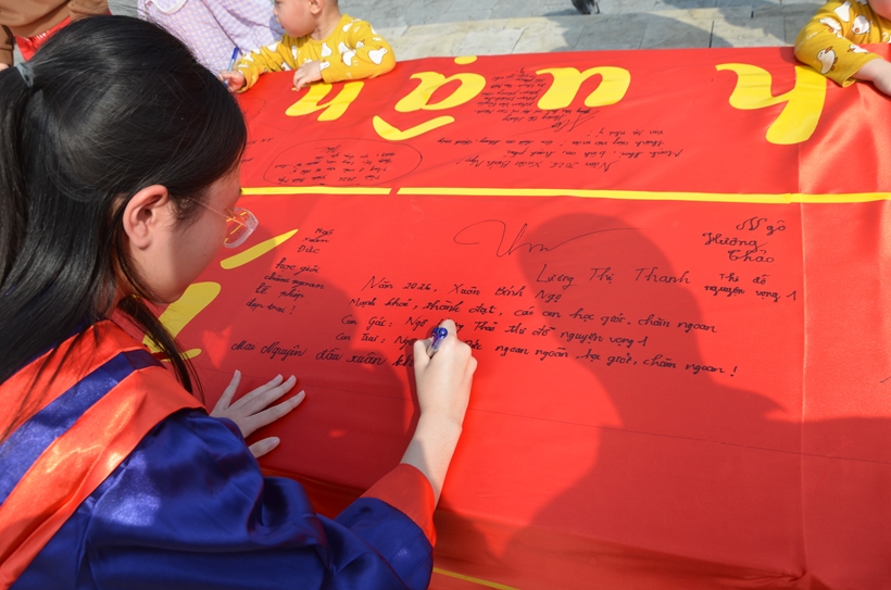 Điểm nhấn của chương trình là nghi thức khai bút tập thể trên dải lụa đỏ dài 65 mét – biểu tượng cho 65 năm trị vì của Vương triều Mạc. Đại diện lãnh đạo thành phố, lãnh đạo xã cùng 9 khối đại diện các tầng lớp Nhân dân đã viết những thông điệp đầu xuân như “Quốc thái dân an”, “Công minh liêm chính”, “Hiếu học thành tài”, “Hanh thông thịnh vượng”, “Mã đáo thành công”… gửi gắm khát vọng về một năm mới bình an, phát triển và bứt phá.