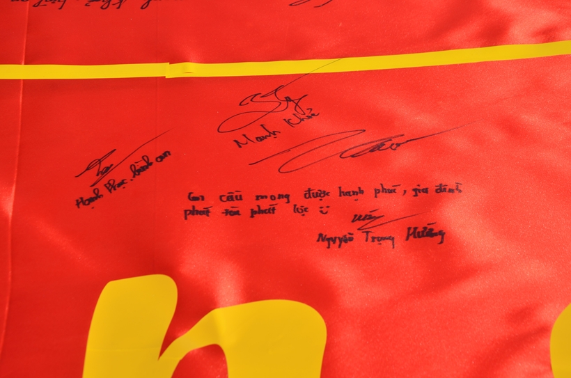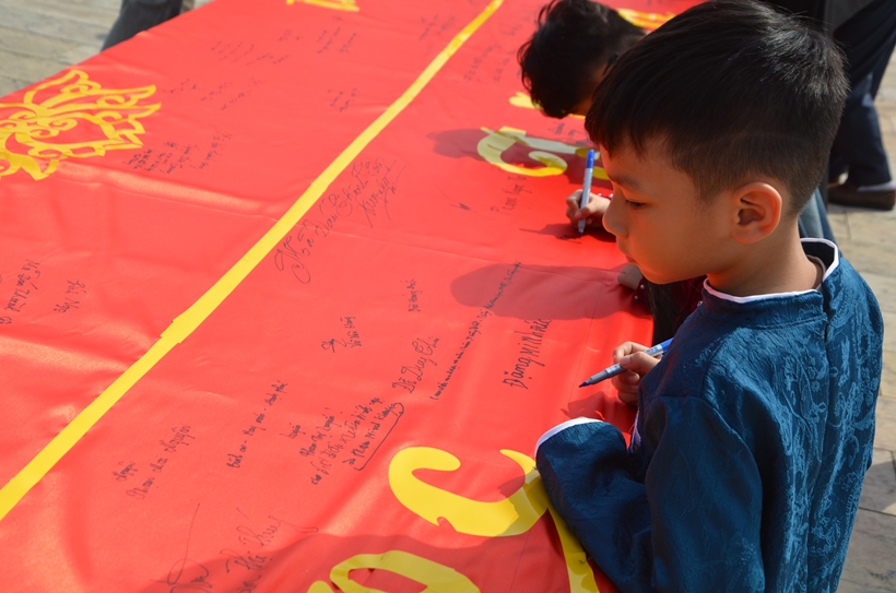 | Nghi thức khai bút tập thể trên dải lụa đỏ dài 65 mét – biểu tượng cho 65 năm trị vì của Vương triều Mạc. |