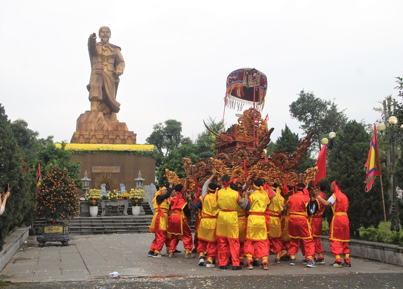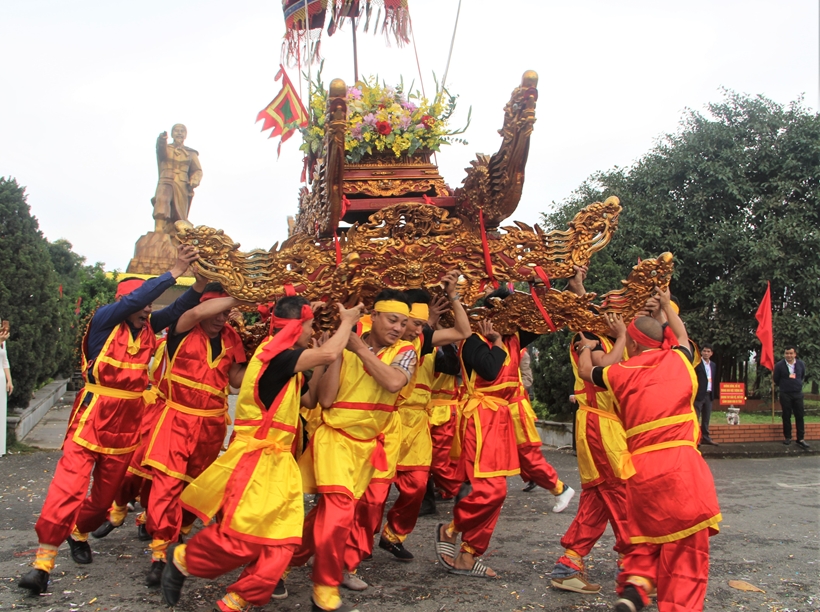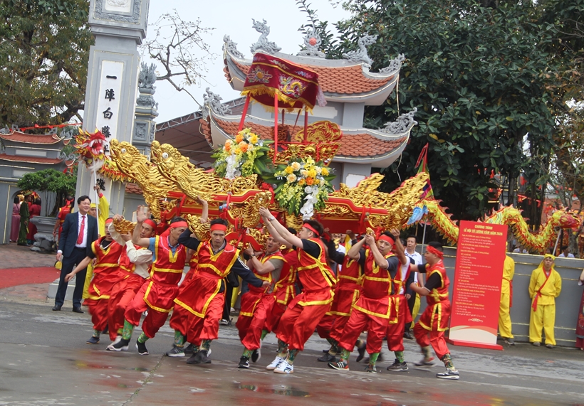 Một trong những điểm nhấn độc đáo của lễ hội là nghi thức “kiệu bay”. Trong tiếng trống thúc dồn dập, đội rước kiệu thực hiện những bước di chuyển linh hoạt, khi tiến, khi lùi, khi xoay tròn uyển chuyển, tạo cảm giác như kiệu đang lướt trên mặt đất. Những chuyển động ấy không chỉ đòi hỏi sự phối hợp nhịp nhàng, sức bền và kỹ thuật cao của đội rước, mà còn mang ý nghĩa tâm linh sâu sắc: thể hiện lòng tôn kính, niềm tin và ước vọng về một năm mới hanh thông, thịnh vượng. Mỗi lần kiệu thăng hoa giữa sân lễ hội là mỗi lần tiếng vỗ tay vang lên, hòa cùng tiếng trống, như nhịp đập nối dài từ quá khứ hào hùng đến hiện tại.