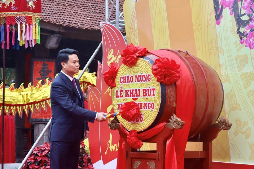 | Chủ tịch UBND TP Hải Phòng Lê Ngọc Châu đánh trống khai bút xuân Bính Ngọ 2026. |