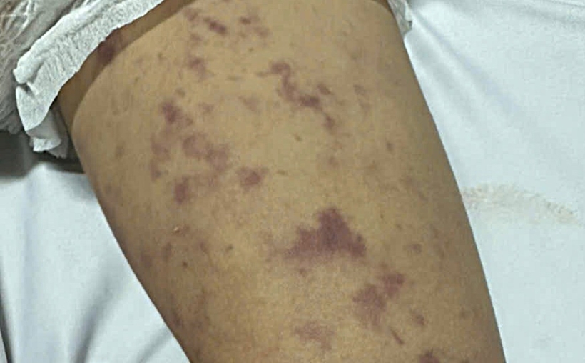 Những nốt tử ban trên da khắp cơ thể bệnh nhi mắc viêm não mô cầu (ảnh: Quang Nhật).