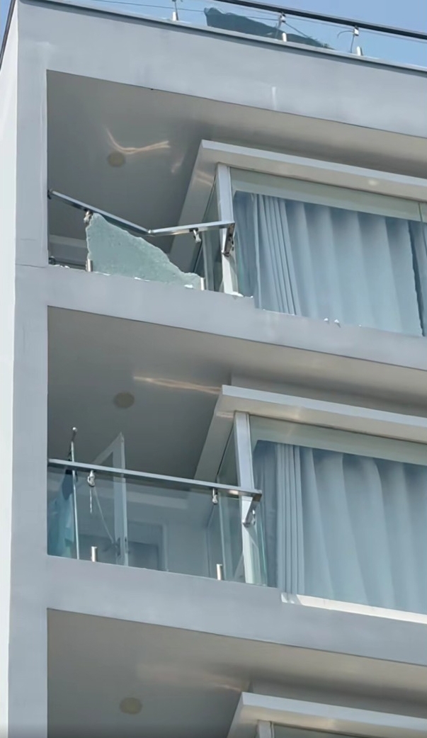 Trong khi lan can ban công tầng 6 (bằng kính), của căn hộ mặt tiền bị vỡ, khung inox gãy gập. Kính chắn gió trước bên tài của chiếc ô tô bị nứt vỡ.