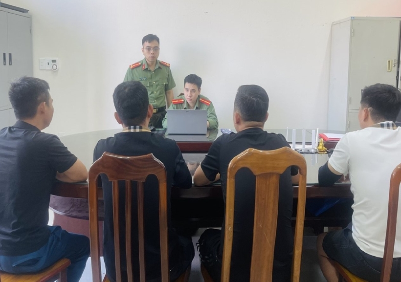| Cán bộ Công an phường Hạ Long làm việc với các trường hợp có hành vi mua bán vé mời trái phép. |