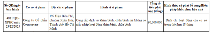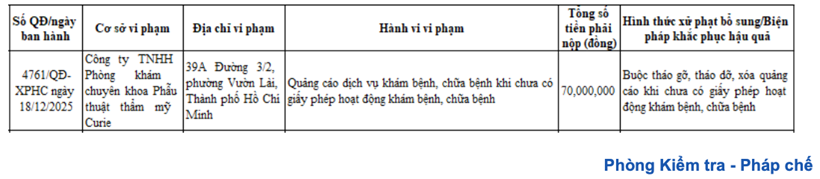 Cụ thể, Công ty TNHH Phòng khám chuyên khoa Phẫu thuật thẩm mỹ Curie (39A Đường 3/2, phường Vườn Lài, TP HCM) bị Sở Y tế TP HCM phạt 70 triệu đồng theo Quyết định số 4761/QĐ-XPHC ngày 18/12/2025, do quảng cáo dịch vụ khám bệnh, chữa bệnh khi chưa có giấy phép hoạt động khám bệnh, chữa bệnh.