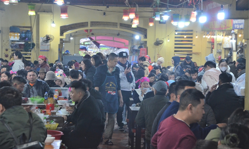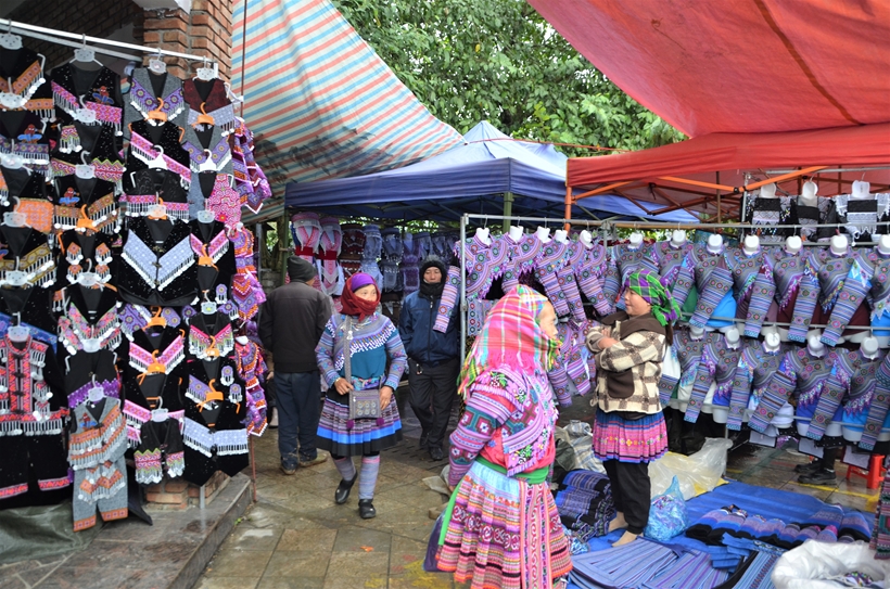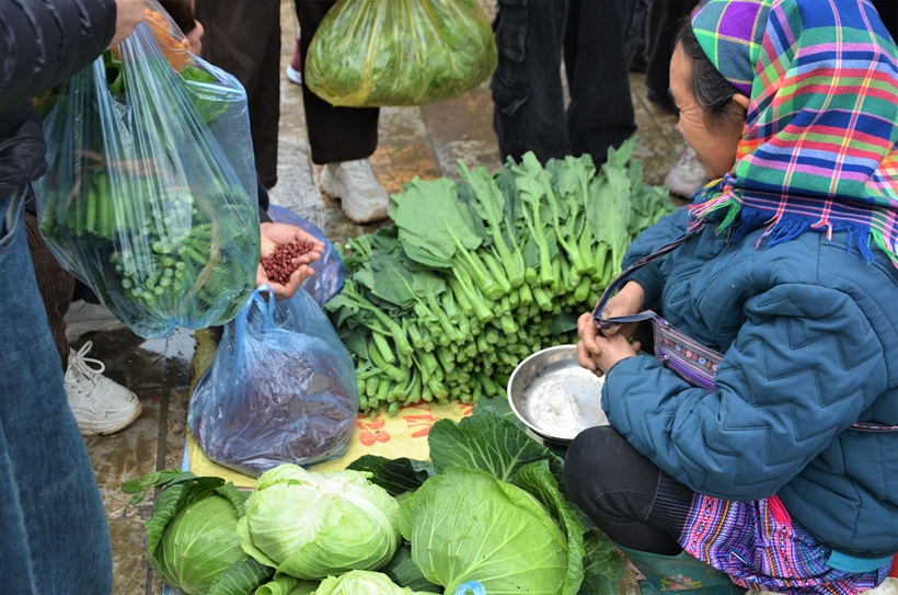 Từ sáng sớm, từng tốp người từ các bản làng xuống chợ. Trên vai là gùi nông sản, trên tay là những bó rau non, những tấm vải thổ cẩm mới dệt. Không gian như được đánh thức bởi sắc màu trang phục truyền thống của phụ nữ Mông, Dao, Tày, Nùng. Váy áo rực rỡ nổi bật giữa nền trời xanh, tạo nên bức tranh mùa xuân sinh động. Du khách đứng giữa dòng người ấy có thể cảm nhận rõ nhịp sống đang chảy, không phải của một điểm tham quan, mà của một cộng đồng đang sinh hoạt thật.