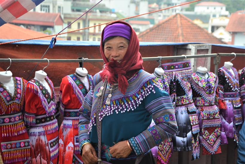 Du khách trải nghiệm mặc đồ truyền thống của đồng bào dân tộc tại khuôn viên của chợ phiên Bắc Hà.