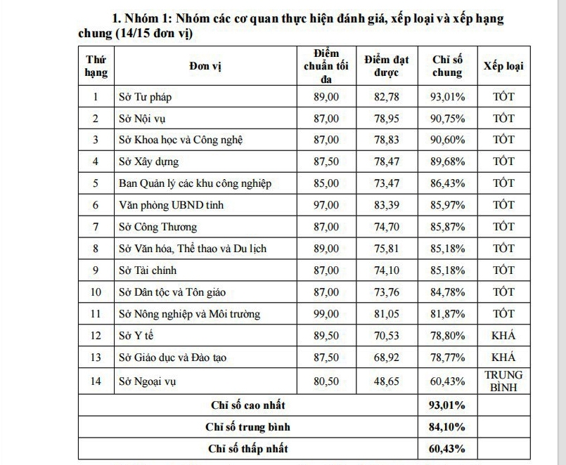 Trong số 15 sở, ngành của tỉnh Lâm Đồng, có 11 sở, ngành xếp loại tốt; 3 sở, ngành xếp loại khá. Sở Tư pháp đứng đầu bảng xếp hạng với chỉ số chung là 93,01%, trong khi Sở Ngoại vụ đứng cuối bảng với chỉ số chung 60,43.