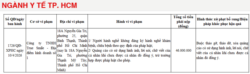 Công ty TNHH True Smile tại địa chỉ 18A Nguyễn Gia Trí (phường Thạnh Mỹ Tây), bị phạt 46 triệu đồng do sử dụng hình ảnh, lời nói của cá nhân trong nội dung quảng cáo khi chưa được sự đồng ý, đồng thời sử dụng nhân sự chưa đăng ký hành nghề.
