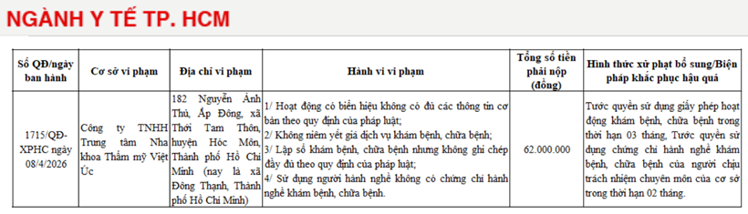 Theo đó, Công ty TNHH Trung tâm Nha khoa Thẩm mỹ Việt Úc tại địa chỉ 182 Nguyễn Ảnh Thủ (xã Đông Thạnh, TP HCM), bị xử phạt 62 triệu đồng.