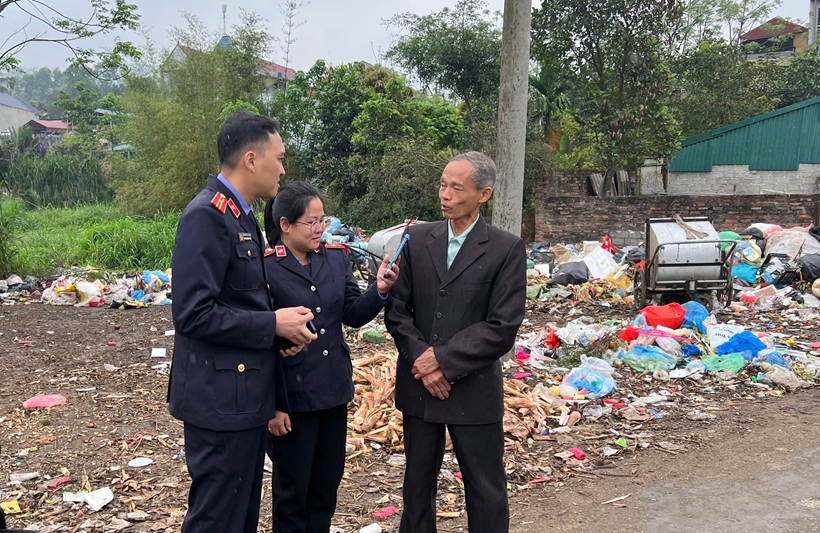 | Kiểm sát viên VKSND khu vực 7 xác định hiện trạng bãi rác. |